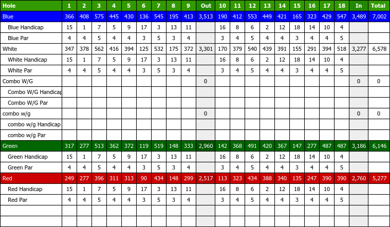 This course has updated information like phone address description or scorecard and is pending approval. 5050 Country Club Dr. The course rating is 00 and it has a slope rating of 0 on Bermuda grass.